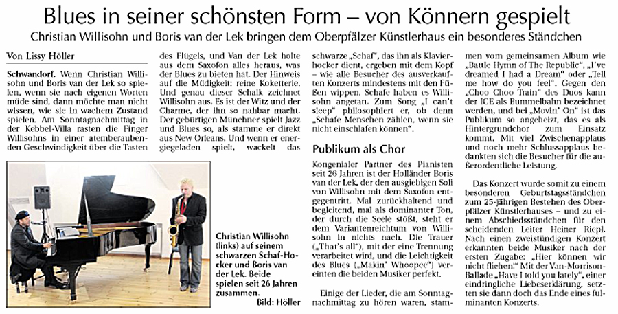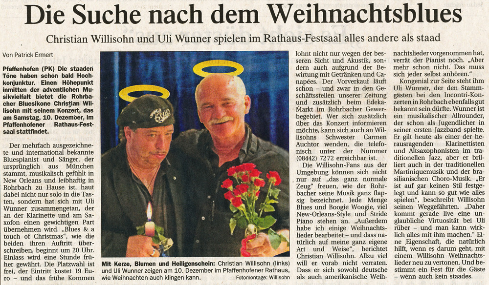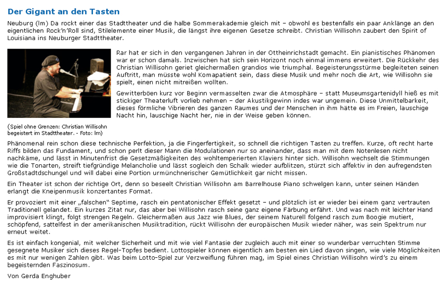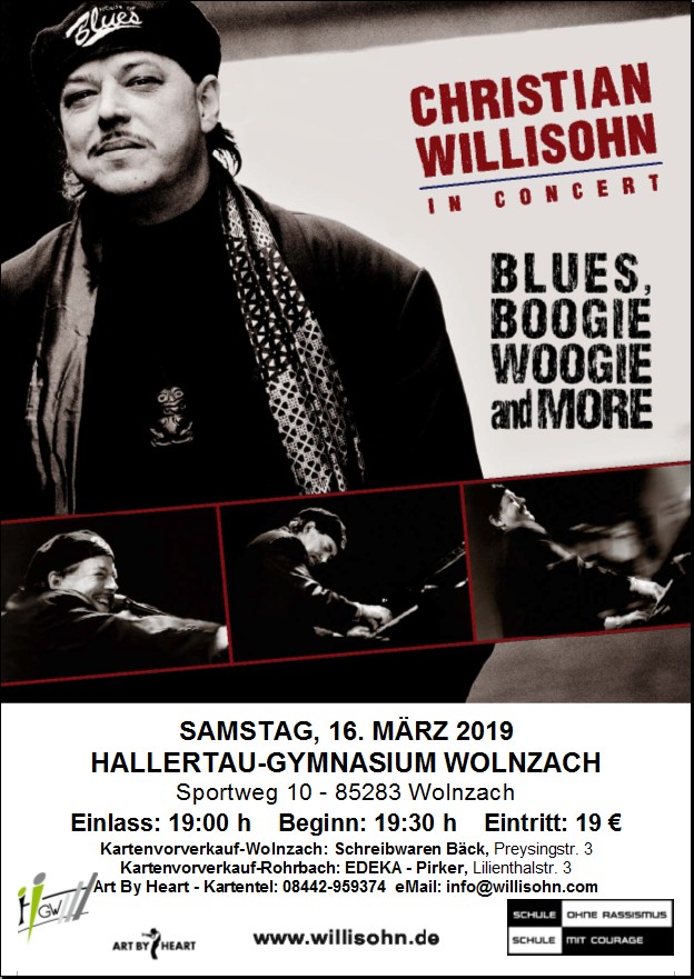 “Richtige Musik“ wird am Hallertau-Gymnasium Wolnzach nicht nur als ein besonderes Profil der Schule hervorgehoben, sondern gleich in drei Säulen des Musikunterrichts angeboten, nämlich mit Musik machen – Musik erleben – Musik erforschen. Wer selbst musiziert, viel Musik unterschiedlichster Stilrichtungen hört oder sich mit musikalischen Grundlagen beschäftigt, ist Teil einer ganz speziellen Kommunikation innerhalb einer Gemeinschaft. Und wer könnte diese besondere musikalische Kommunikation besser vermitteln als der weltbekannte Blues-Pianist und Sänger Christian Willisohn, der anlässlich der 25-Jahr-Feier des HGW in der Schule ein Solokonzert geben wird mit dem Titel: “Blues, Boogie Woogie and more“ Darüber hinaus ist CW seit 2013 Pate des Gymnasiums für die “Schule ohne Rassismus – Schule mit Courage“, einer bundesweiten Initiative von Schülerinnen und Schülern, die sich aktiv gegen jede Form von Diskriminierung einsetzen wollen. Mit seinem Konzert leistet auch er einen Beitrag innerhalb eines mehr denn je wichtigen Netzwerks für Menschenrechte und gegen jede Form der Ausgrenzung und Ablehnung. |